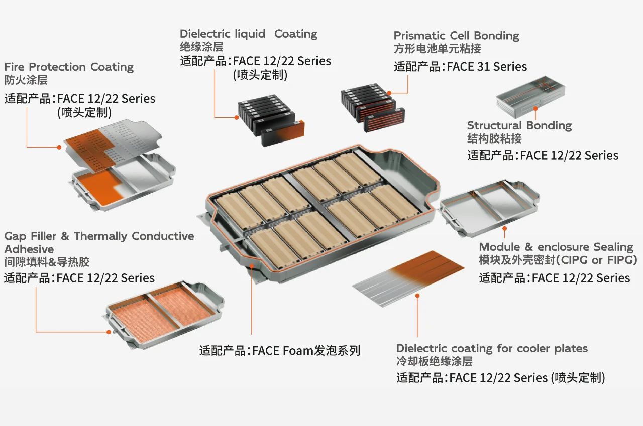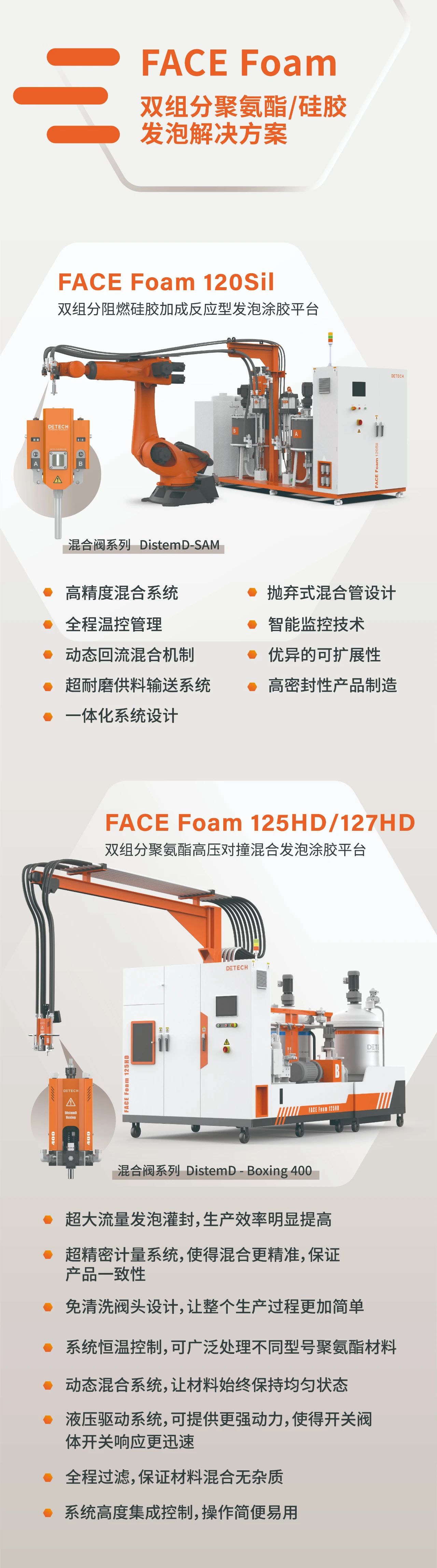 DETECH在雙組分硅膠發(fā)泡領(lǐng)域擁有領(lǐng)先的技術(shù),尤其是其FACE Foam 120Sil平臺,在電池密封應(yīng)用中表現(xiàn)出色。這款平臺專門用于雙組分硅膠發(fā)泡,廣泛應(yīng)用于電動汽車電池的密封和防護。