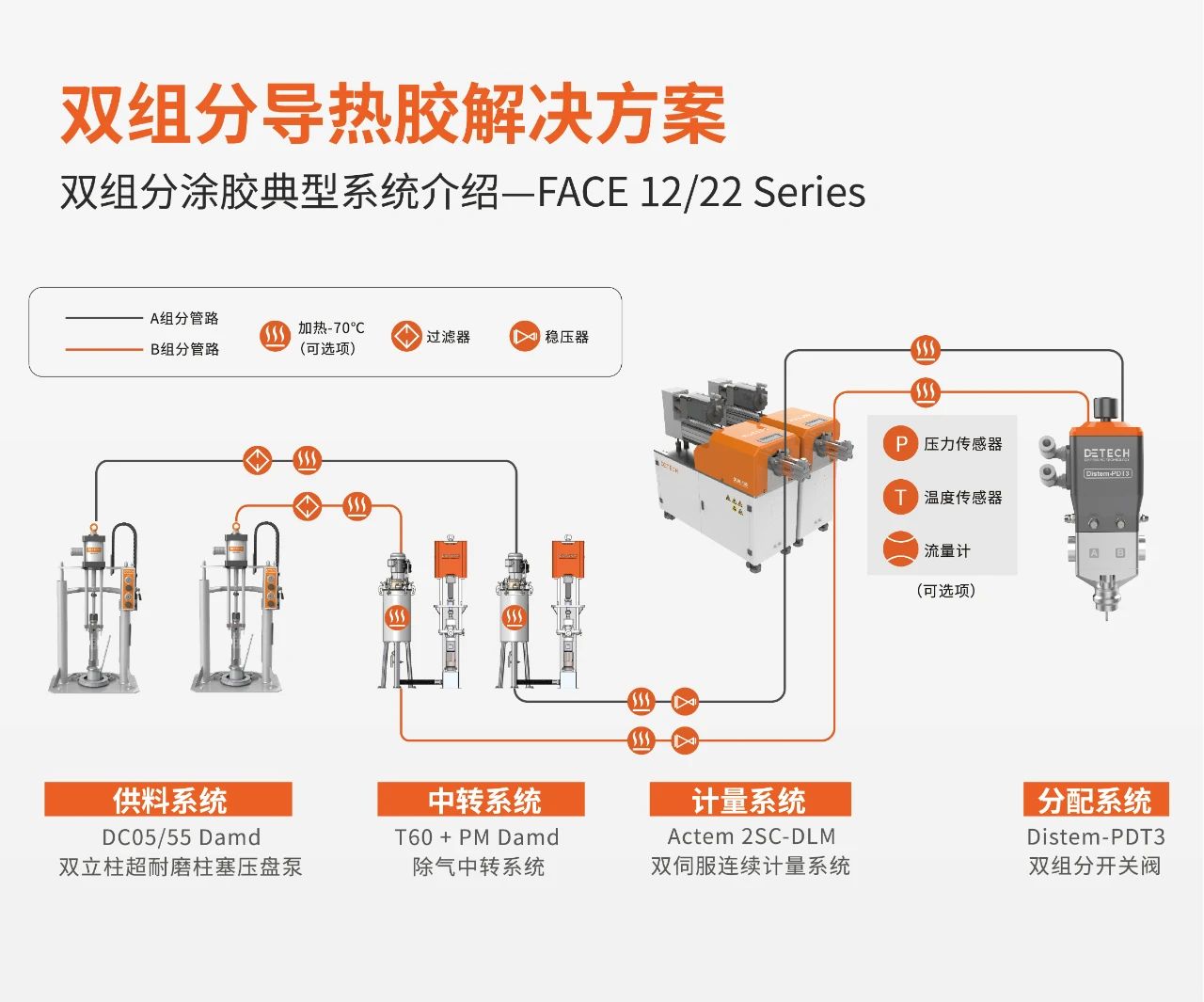 作為行業(yè)內(nèi)流體領(lǐng)域的領(lǐng)軍企業(yè),DETECH受邀參展,并在大會上展示了多款創(chuàng)新解決方案,涵蓋了雙組分聚氨酯/硅膠解決方案、高性能導(dǎo)熱膠以及丁基熱熔膠解決方案,特別是動力電池涂膠組裝整體解決方案。